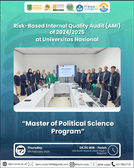 Day/Date : Thursday, 5th February 2026 Time : 09.00 WIB – Finish Place : Cyber Library Meeting Room #unas1949 #universitasnasional #pionirperubahan #bpm #badanpenjaminanmutu #badanpenjaminanmutuunas #kemdiktisaintek #lldikti3 #kampusberdampak