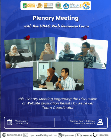 Day/Date : Wednesday, 1st April 2026 Time : 14.00 WIB Place : Seminar Room 3rd Floor #unas1949 #universitasnasional #pionirperubahan #bpm #badanpenjaminanmutu #badanpenjaminanmutuunas #kemdiktisaintek #lldikti3 #kampusberdampak