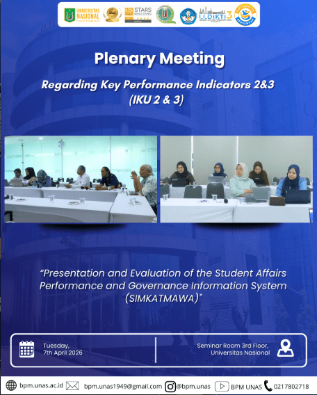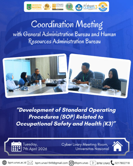 Day/Date : Tuesday, 7th April 2026Time : 13.00 WIBPlace : Seminar Room 3rd Floor. #unas1949#universitasnasional#pionirperubahan#bpm#badanpenjaminanmutu#badanpenjaminanmutuunas#kemdiktisaintek#lldikti3#kampusberdampak