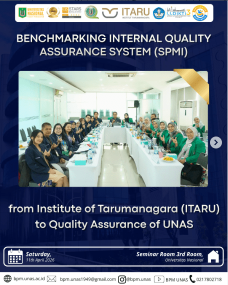 Day/Date : Saturday, 11th April 2026Time : 08.00 – 13.00 WIBPlace : Seminar Room 3rd Floor, UNAS #unas1949#universitasnasional#pionirperubahan#bpm#badanpenjaminanmutu#badanpenjaminanmutuunas#kemdiktisaintek#lldikti3#kampusberdampak