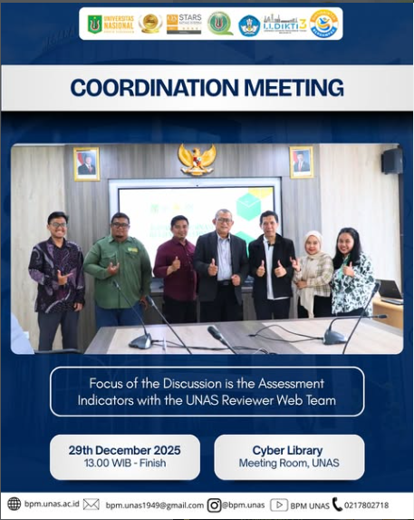 Day/Date : Monday, 5th January 2026 Time : 10.00 WIB – Finish Place : FEB Meeting Room, 2nd Floor Bloc B #unas1949 #universitasnasional #pionirperubahan #bpm #badanpenjaminanmutu #badanpenjaminanmutuunas #kemdiktisaintek #lldikti3 #kampusberdampak